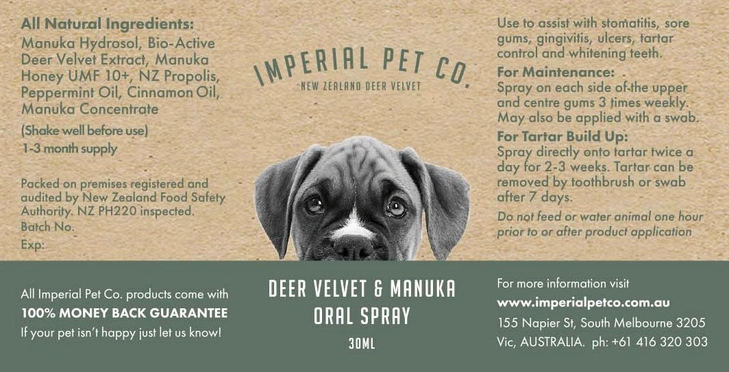 Imperial Pet Co Canine Oral Spray ingredients are 100% natural and sourced from New Zealand. Our Imperial Pet Co Canine Oral Spray makes caring for your pet’s dental health easier than ever. This product can be used routinely to maintain excellent oral health.