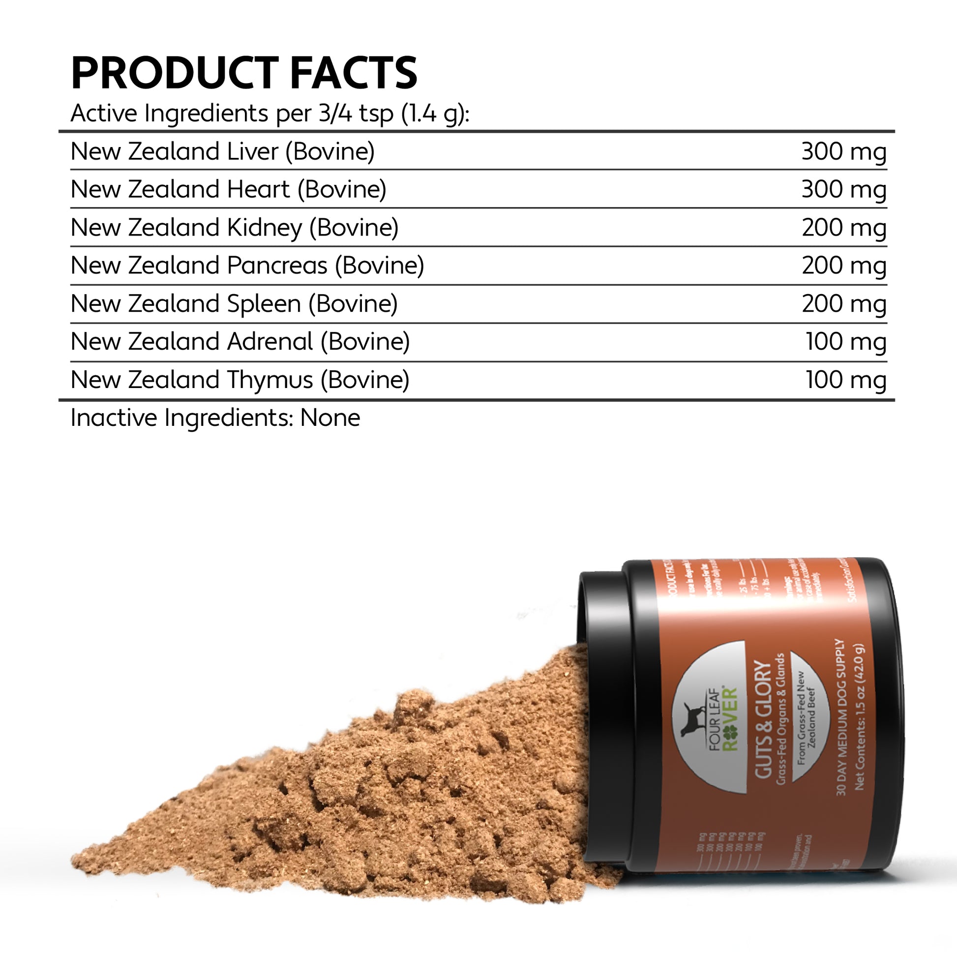“Our terrier has a very difficult time keeping down organ meat. It was saddening and quite gross. She doesn't throw up Guts & Glory, works like a charm”