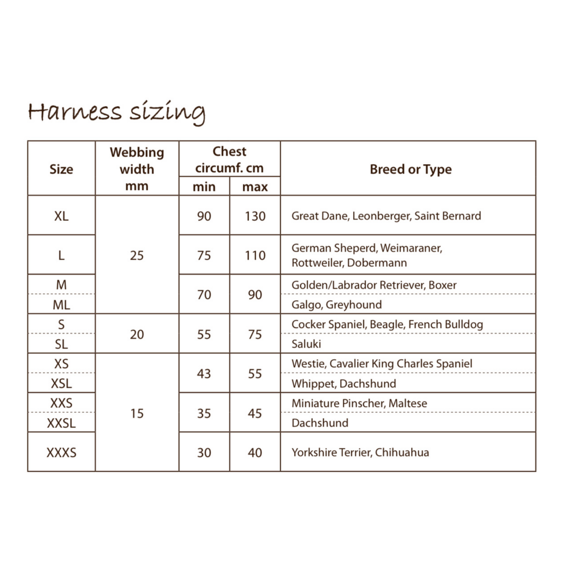 The accurate study and development of the sizing and the five-point adjusting system ensure an excellent fit and adaptability of the harness to the specific dimensions and proportions of the dog.