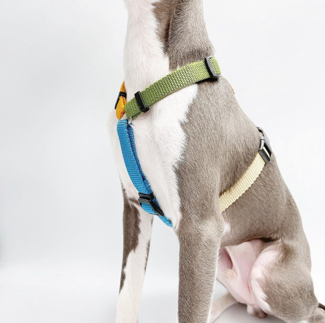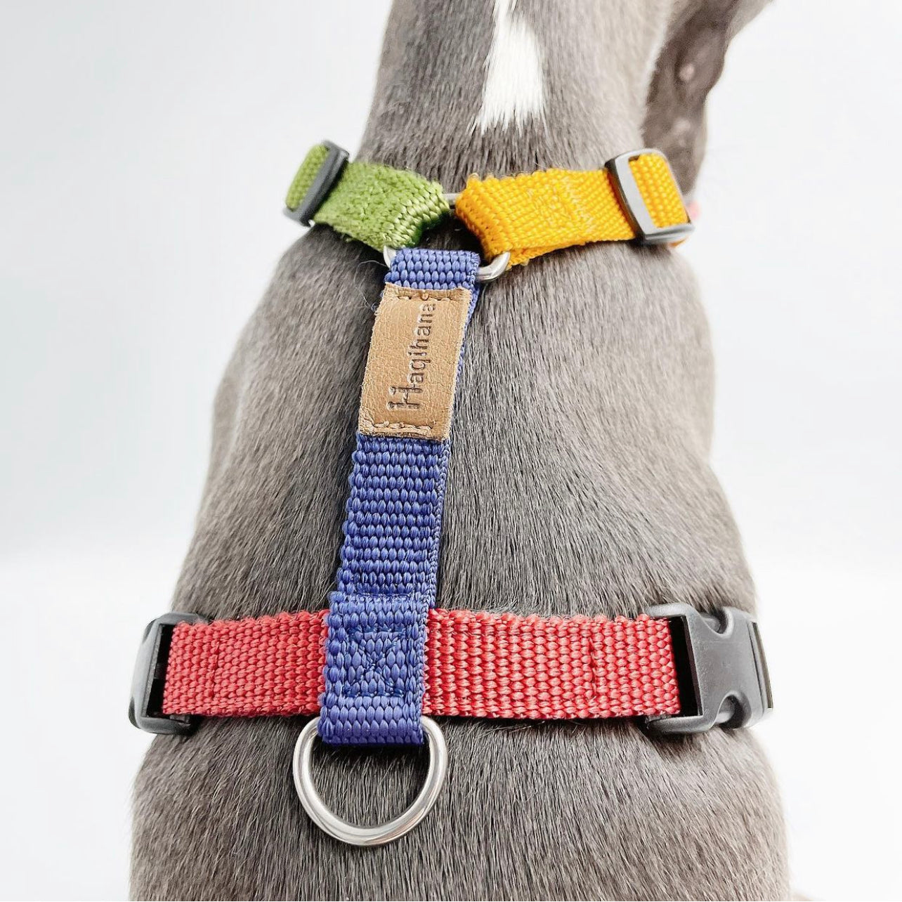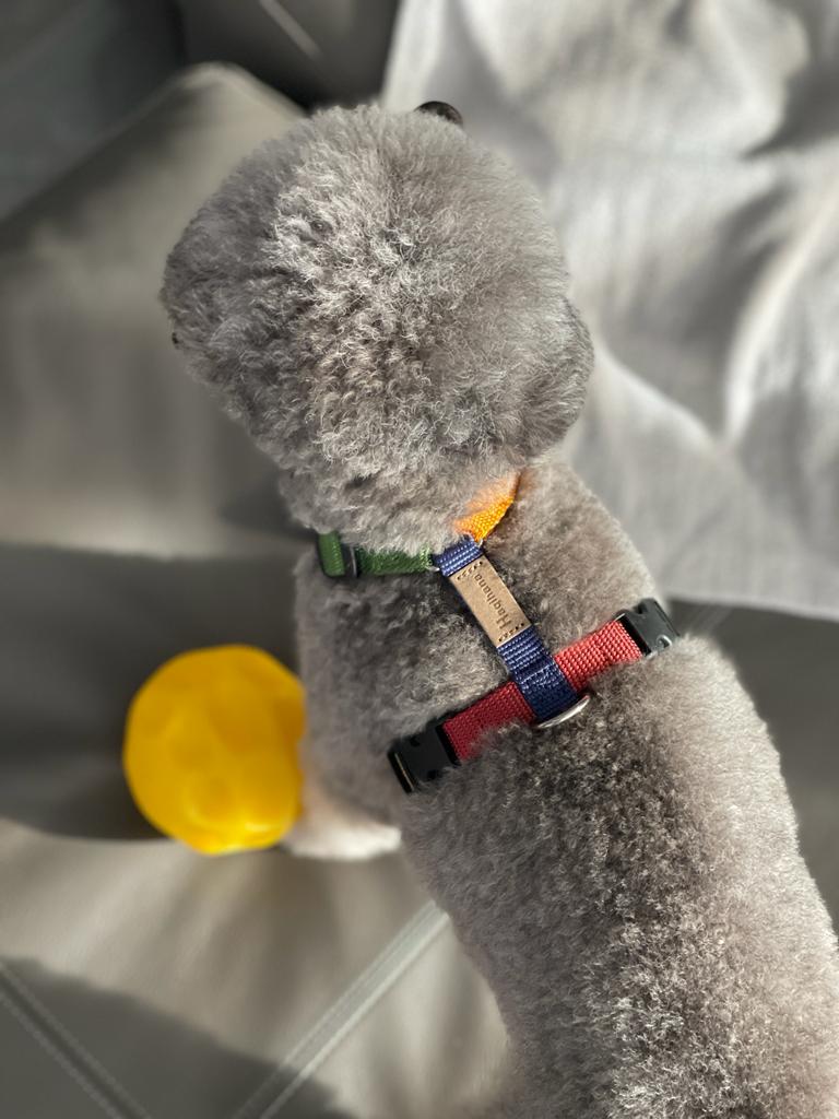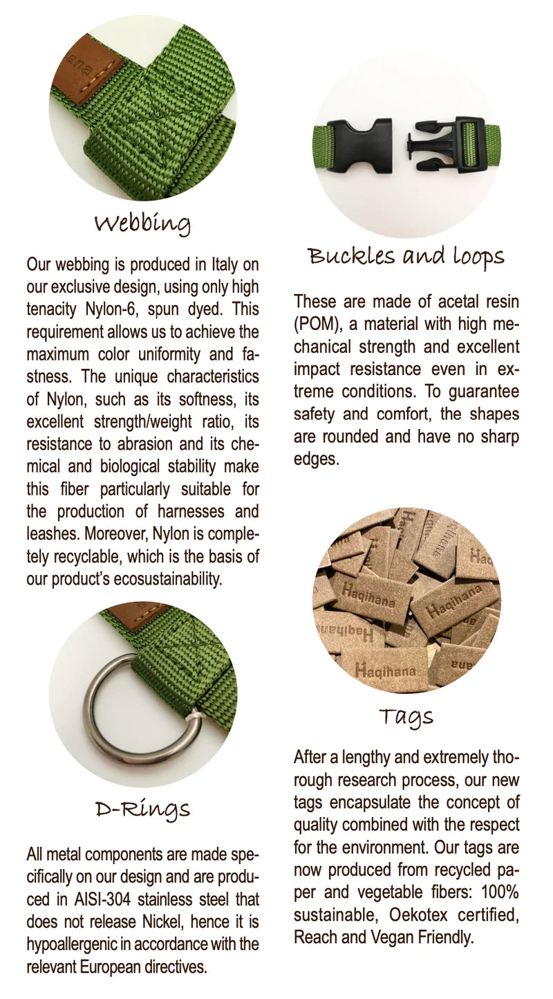 Our webbing is produced in Italy on our exclusive design, using only high tenacity Nylon-6, spun dyed. This requirement allows us to achieve the maximum color uniformity and fa-stness. The unique characteristics of Nylon, such as its softness, its excellent strength/weight ratio, its resistance to abrasion and its chemical and biological stability make this fiber particularly suitable for the production of harnesses and leashes. Moreover, Nylon is completely recyclable, which is the basis of our products ecosustainability.